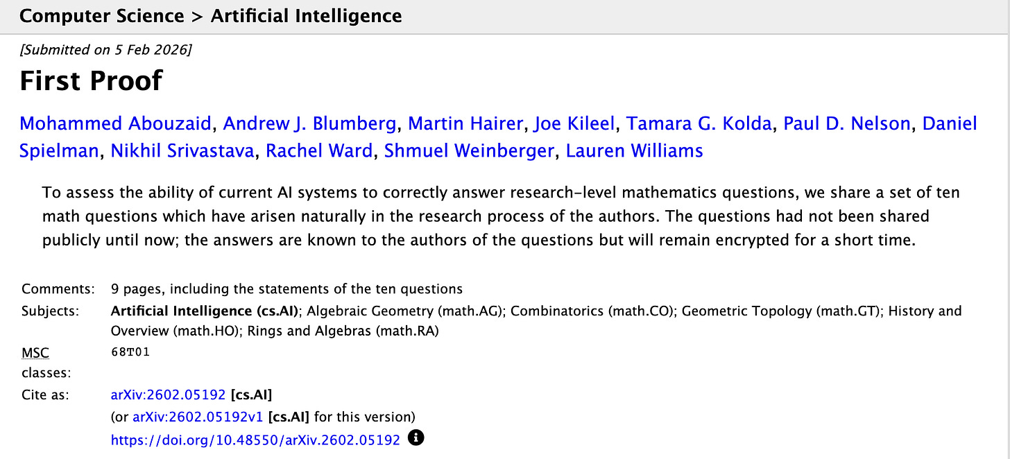 Results are in for the “first proof” experiment. First Proof is a project by a group of mathematicians, led by Mohammed Abouzaid (Stanford), Nikhil Srivastava (Cal), Rachel Ward (UT Austin), and Lauren Williams (Harvard), that tests whether AI systems can solve research-level math problems on their own. It presents ten original questions drawn from the authors’ own research across diverse areas of mathematics for which solutions exist but have not yet been published. (I am one of the problem contributors.) These are specialist problems which would normally require at least a graduate student with specialized knowledge to solve them. This is an attempt to develop a realistic way to measure AI’s ability to do genuine mathematical research, and the plan is to repeat this experiment with new problems in the future.